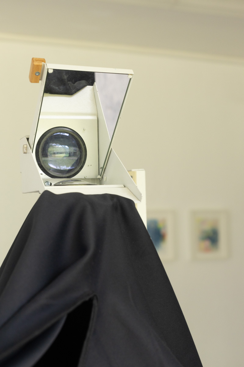Kamera II is an installation that focuses on the concept of projection. An overhead projector, covered in dense blackout fabric, inverting its original task from creating to recieving. By peering inside, viewers witness a live projection of the room behind them, achieved purely through the basic principles of light and lens refraction.